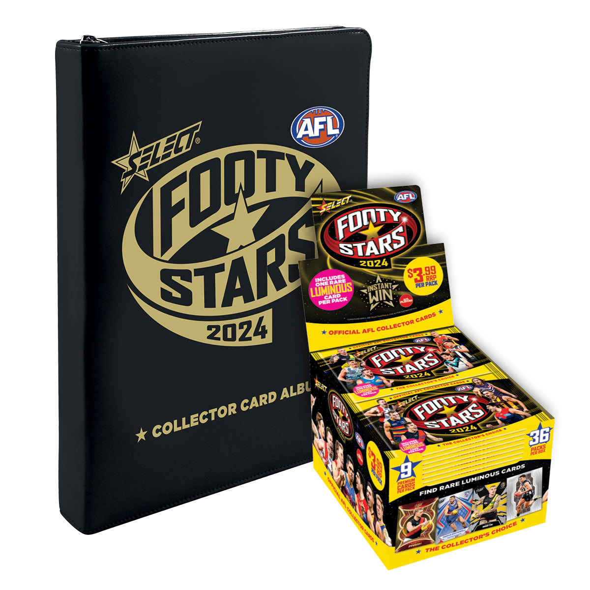 - Box of 2024 AFL Footy Stars bundled with Official 2024 AFL Footy Stars Vinyl Album, with 2 packs of cards and 26 x Card Armour 9 pocket pages.