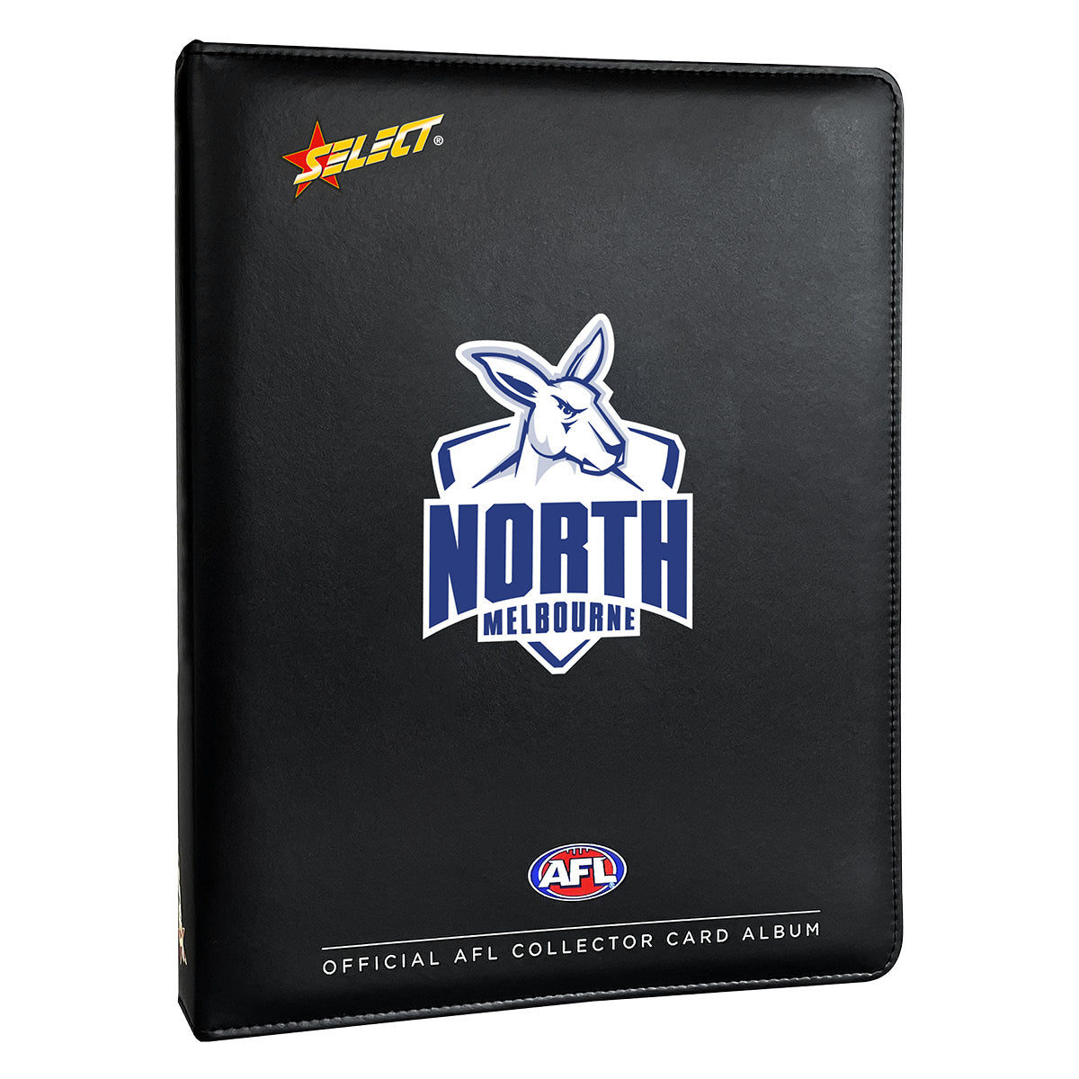 Newly designed Official AFL North Melbourne Logo Album (3 ring binder), including 25 x Card Armour 9 Pocket Pages inside! Now with a zipper enclosure to give the album a total seal.
